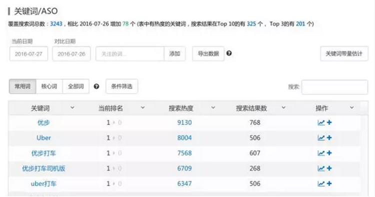 找一个“关键词”覆盖的搜索词也比较容易,一般的ASO工具,“ASO/搜索词”页面都有查找功能,直接查找这个词即可,假设“优步uber”只填写了“优步”这个关键词,搜索“优步”如下图所示: