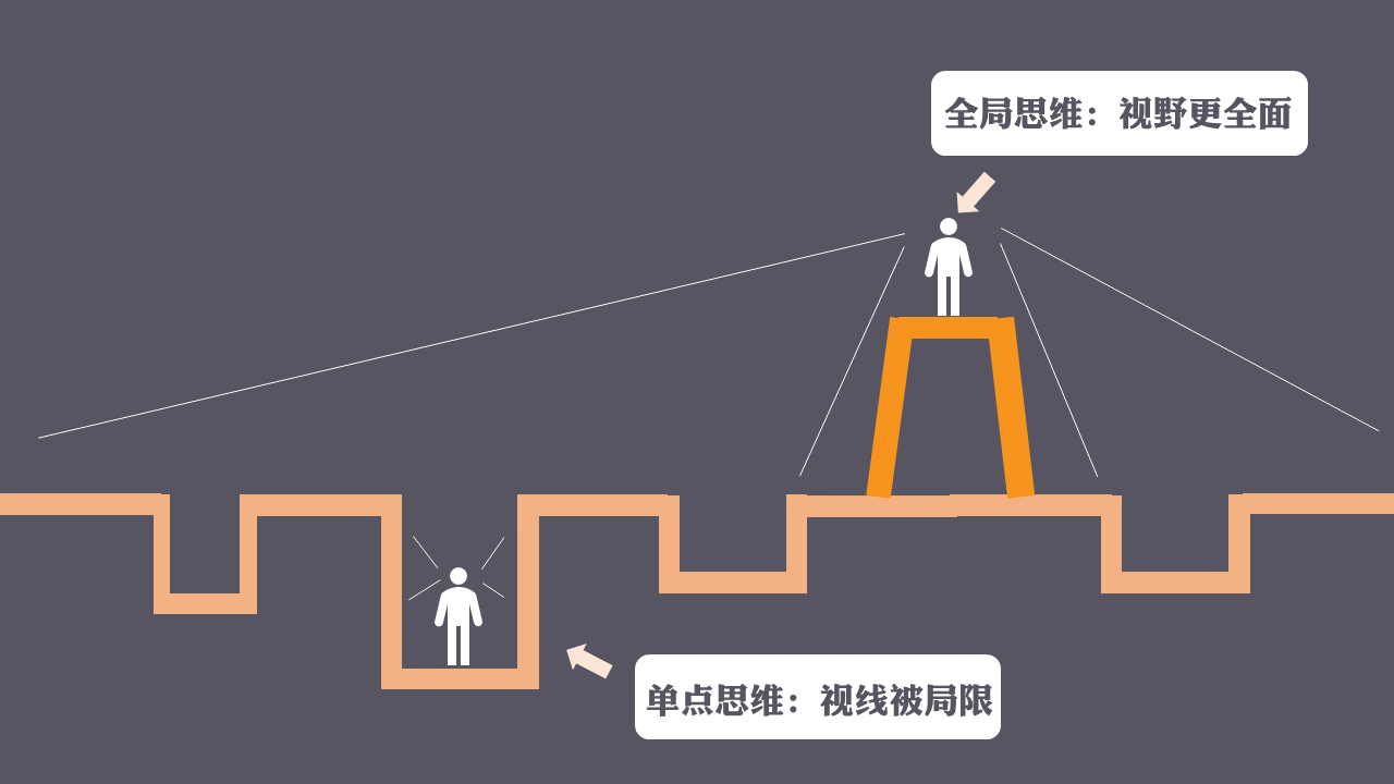 如果没有全局思维,很多事情其实你根本不知道怎么去做好,比如超越预期,如果你仅仅关注手上的事情,是很难在大的层面上超越上司的预期,也很难让自己进步。