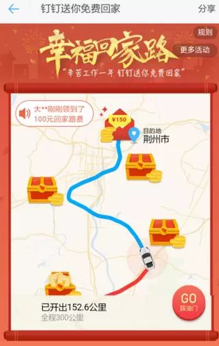 这是一个2016年春节前夕的活动。该活动的规则较为简单,是一个简单的拉新为导向的活动:用户不停的拉入新人,组成自己的回家助力团,每拉一个人就可以踩一脚油门。