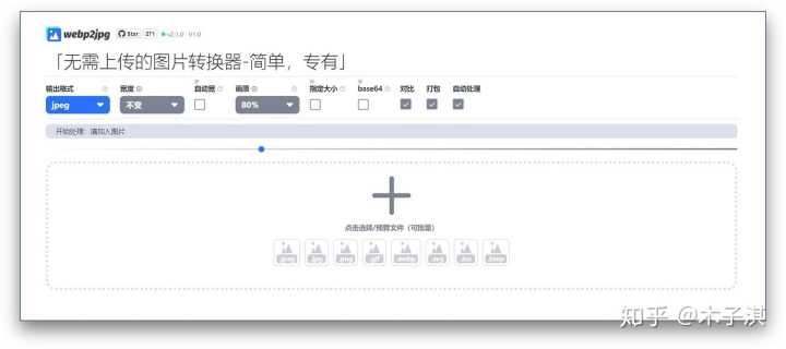Webp2jpg 是一个无需上传的图片转换器,它无需上传,使用浏览器自身进行转换,保证你图片的安全。它完全免费,功能强大,支持批量上传图片,支持多种图片格式转换;它支持上传的图片格式包括:JPEG 、JPG 、PNG 、GIF 、WEBP 、SVG 、ICO 、BMP ,支持输出的图片格式包括:JPEG 、PNG 、GIF 、WEBP 动画,GIF 文件。它还支持输出指定大小图片、指定宽度图片、指定画质图片;它的转换速度非常快,整体体验非常不错。
